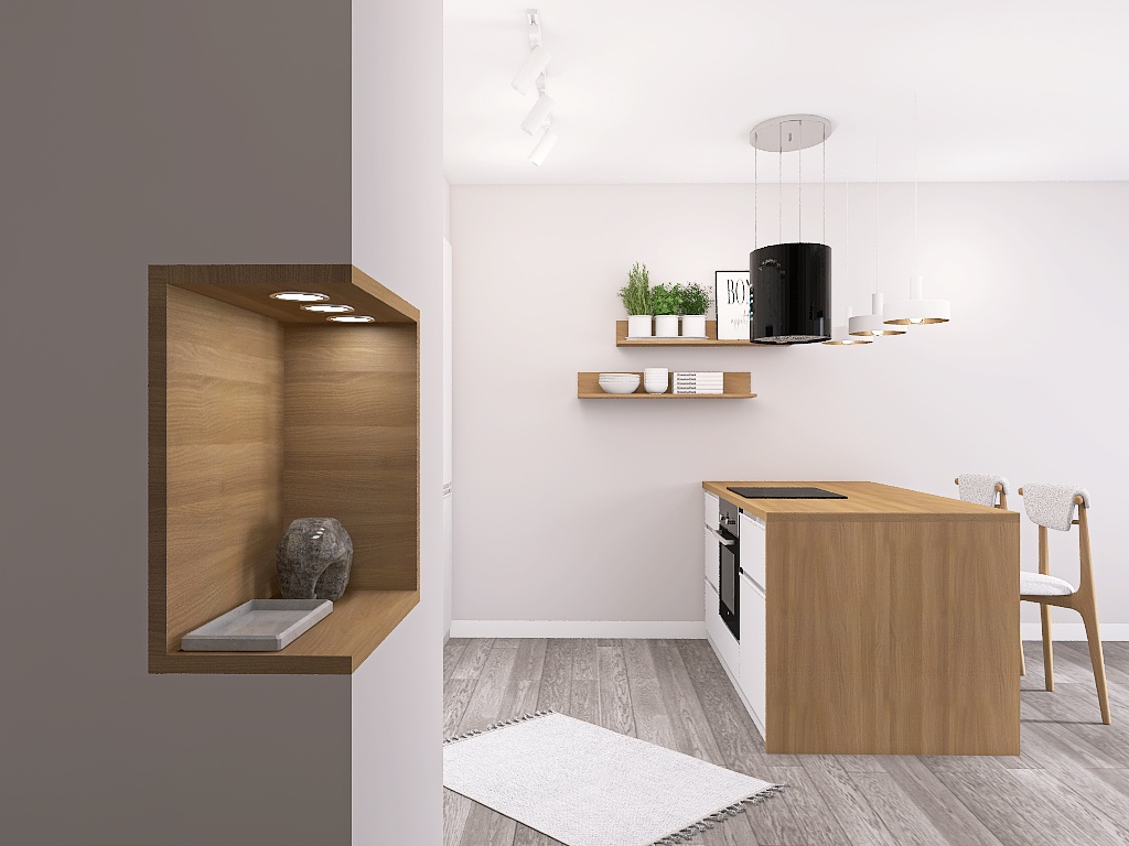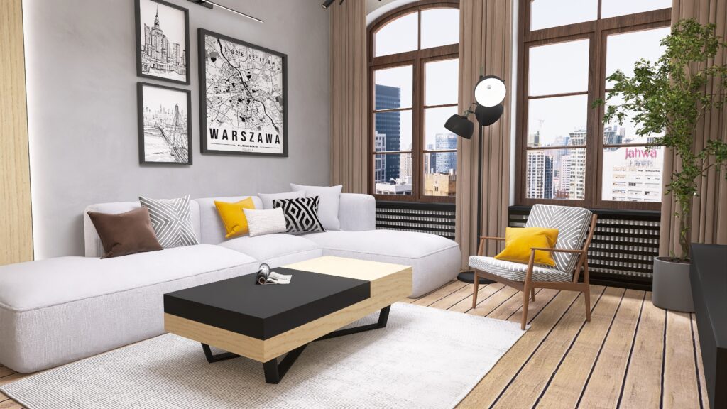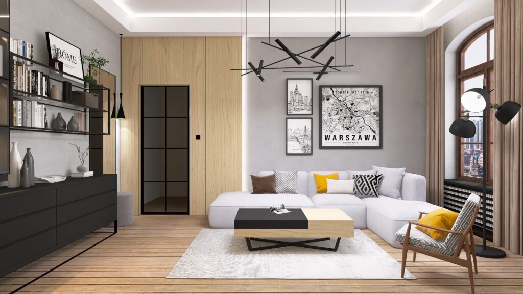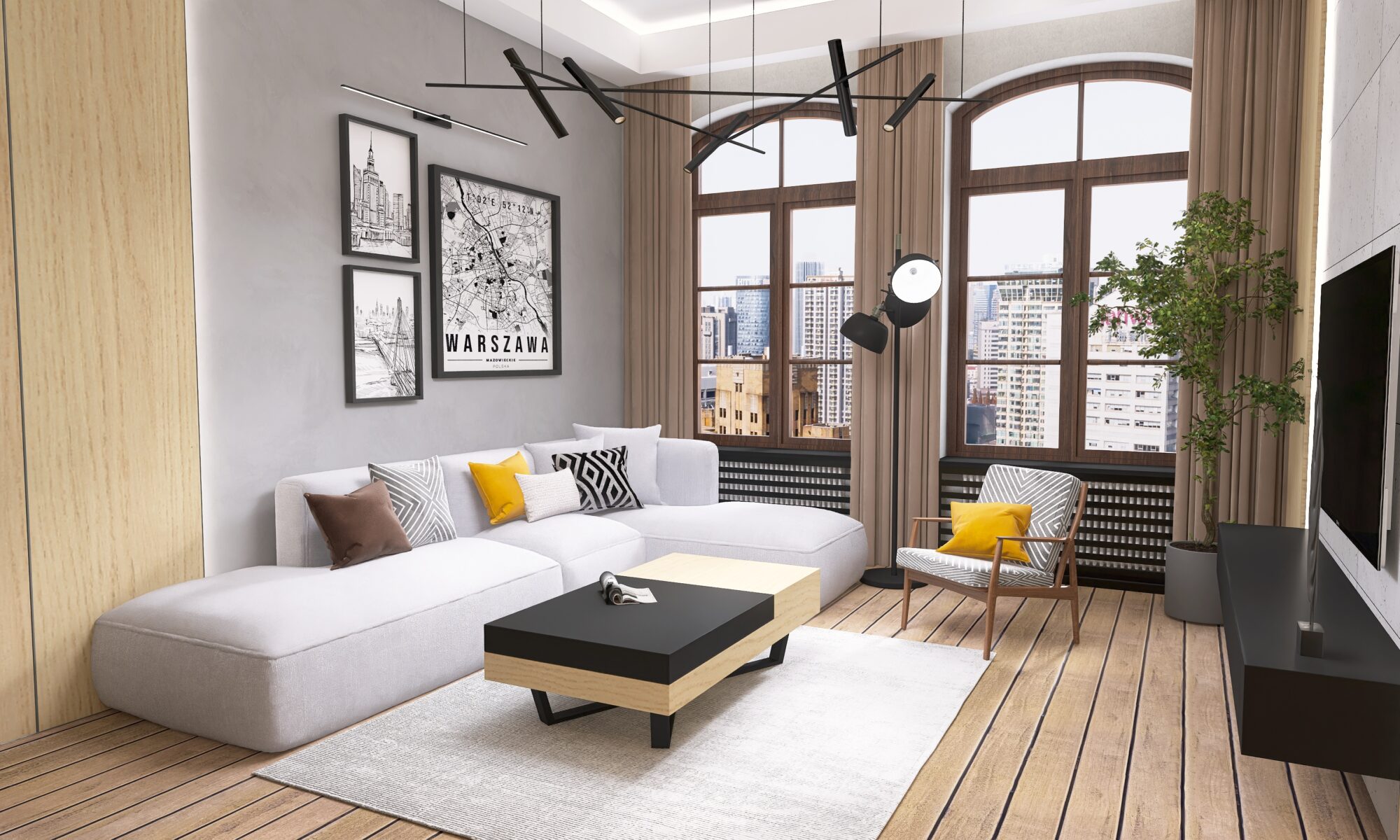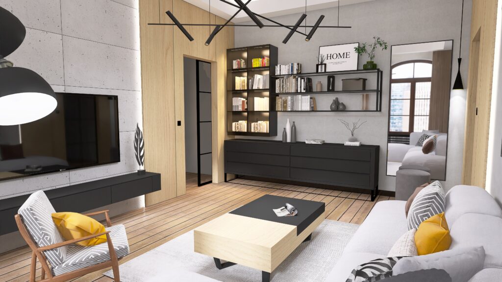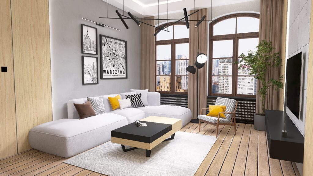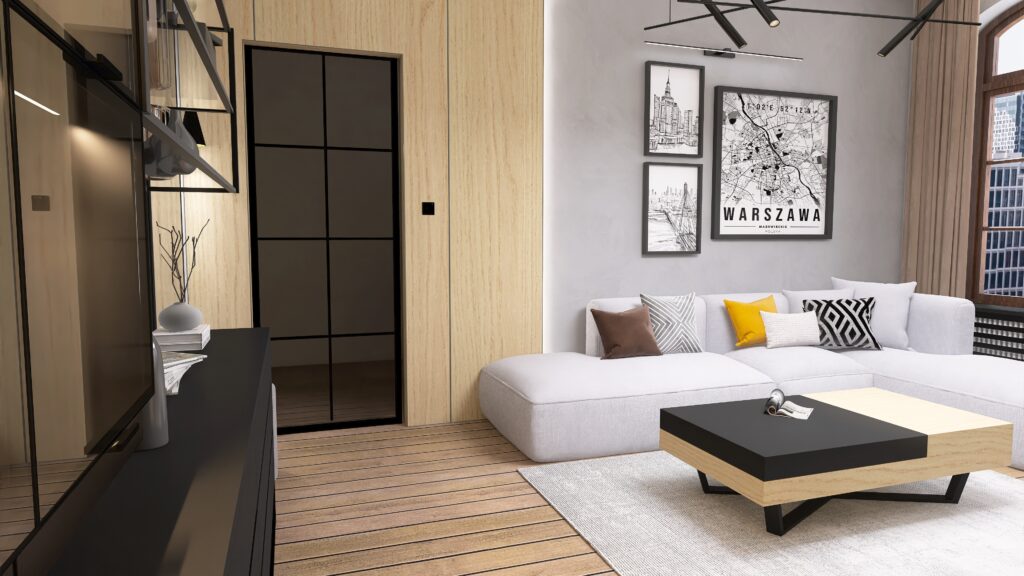 Oświetlenie to kolejny atut – główne oświetlenie szynowe daje nowoczesny i praktyczny efekt, uzupełniony o nastrojowe LED-y i designerską lampę przy sofie, która zadba o odpowiedni klimat podczas wieczornego relaksu. A jeśli mowa o relaksie – wygodna sofa narożna aż zaprasza, by rozsiąść się wygodnie i zanurzyć w ulubionym serialu.
