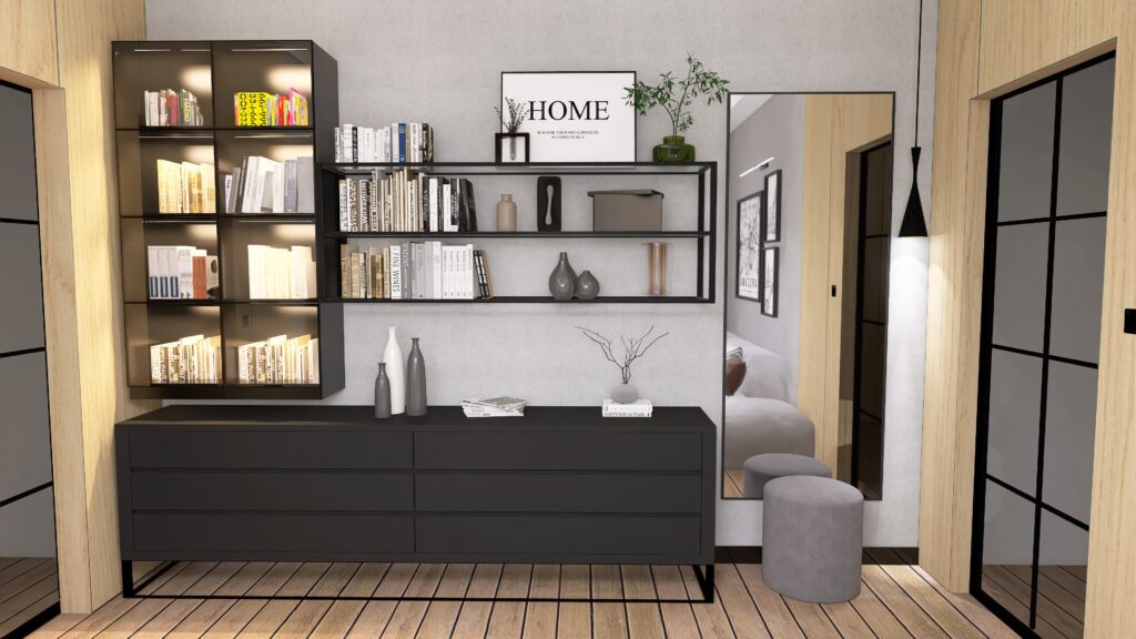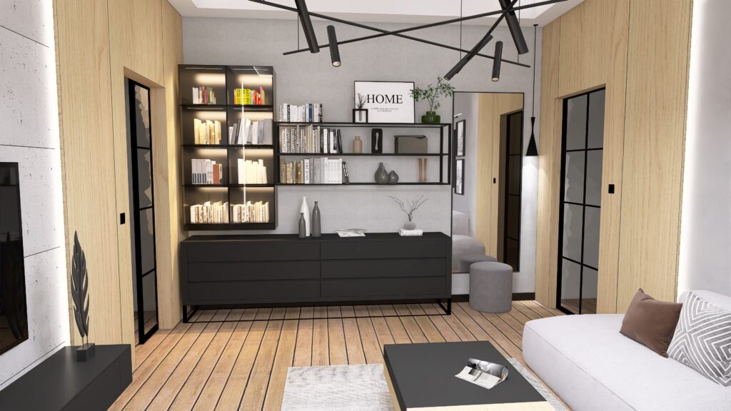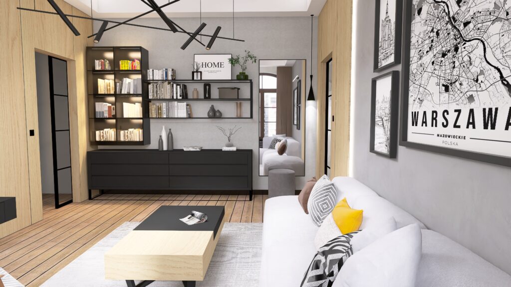 Całą uwagę w tej części salonu z zamysłem skrada pokaźny regał, który pomieści całą kolekcję książek ukochanych przez inwestorów. To właśnie on gra tu pierwsze skrzypce, dodając wnętrzu charakteru i przywołując klimat domowej biblioteczki.