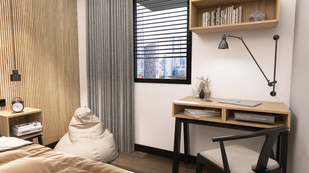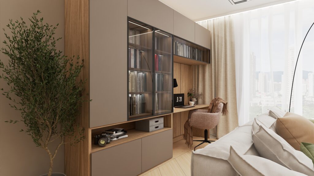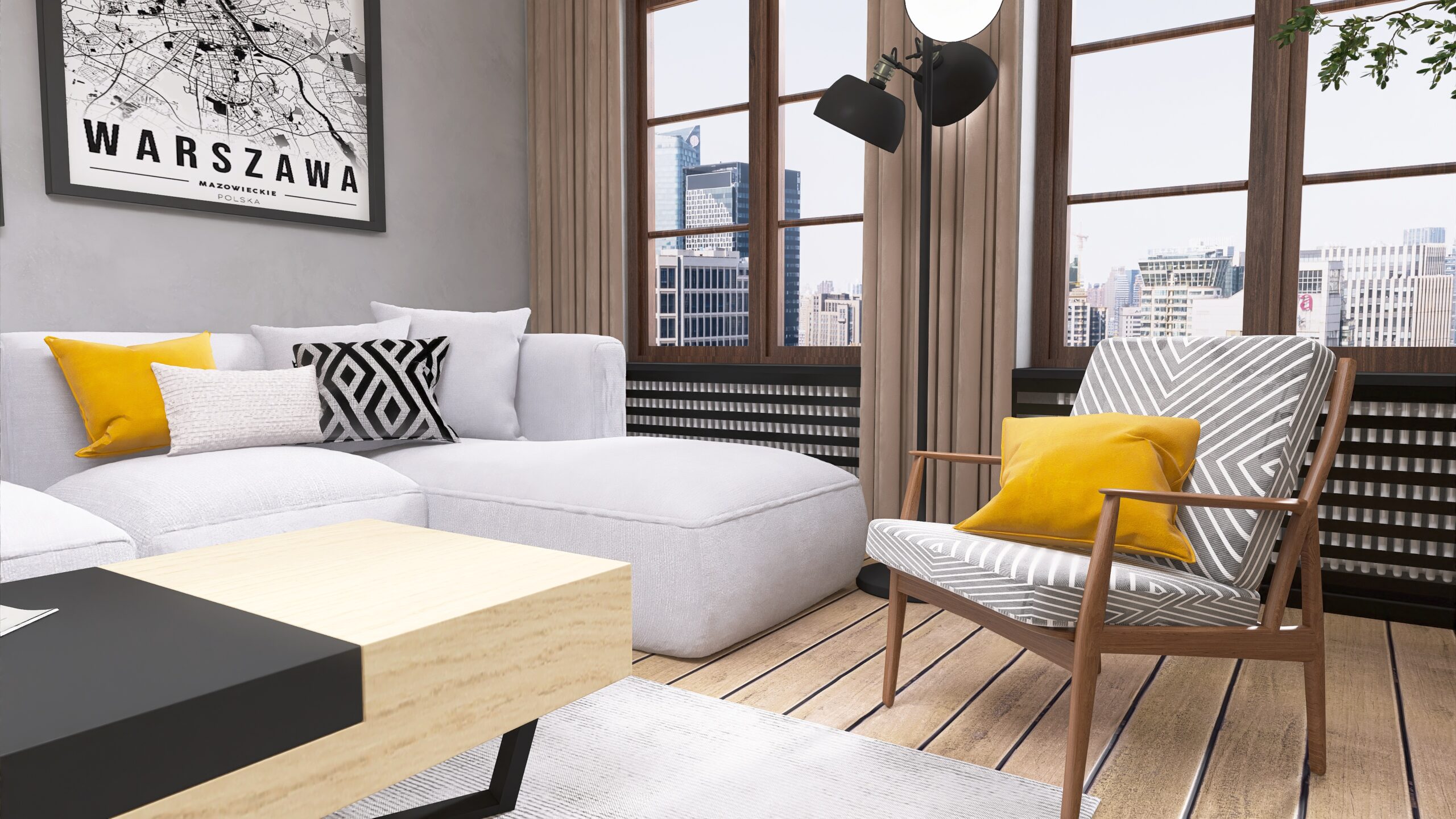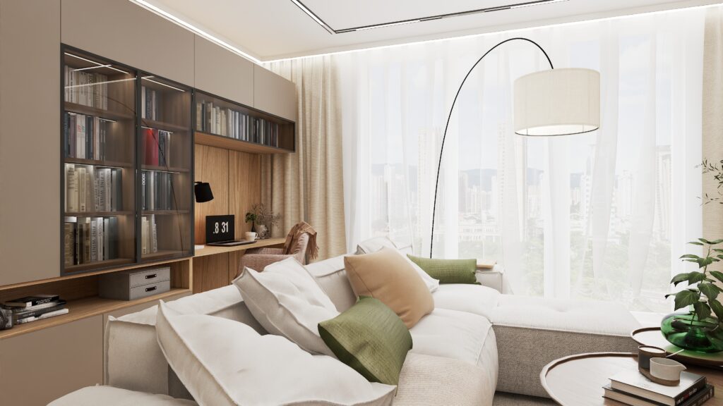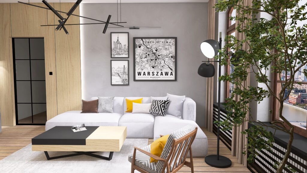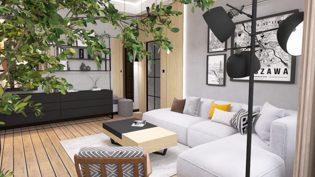 We wnętrzu zadbałam o to by estetyka współgrała zgodnie z funkcjonalnością. Za sofą kryje się sprytnie miejsce do pracy – wkomponowane we wnętrze tak, że zupełnie nie rzuca się w oczy! Dzięki temu salon wciąż zachowuje swoją lekkość i przytulny charakter, zapewniając jednocześnie wygodną przestrzeń roboczą.