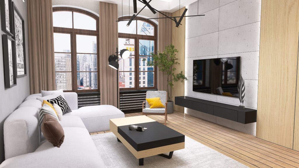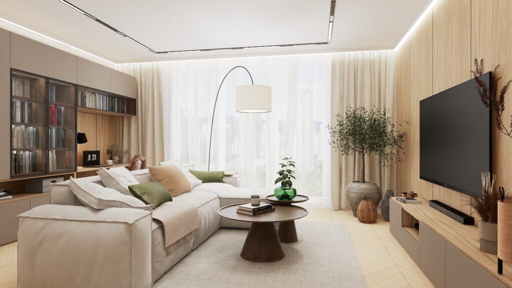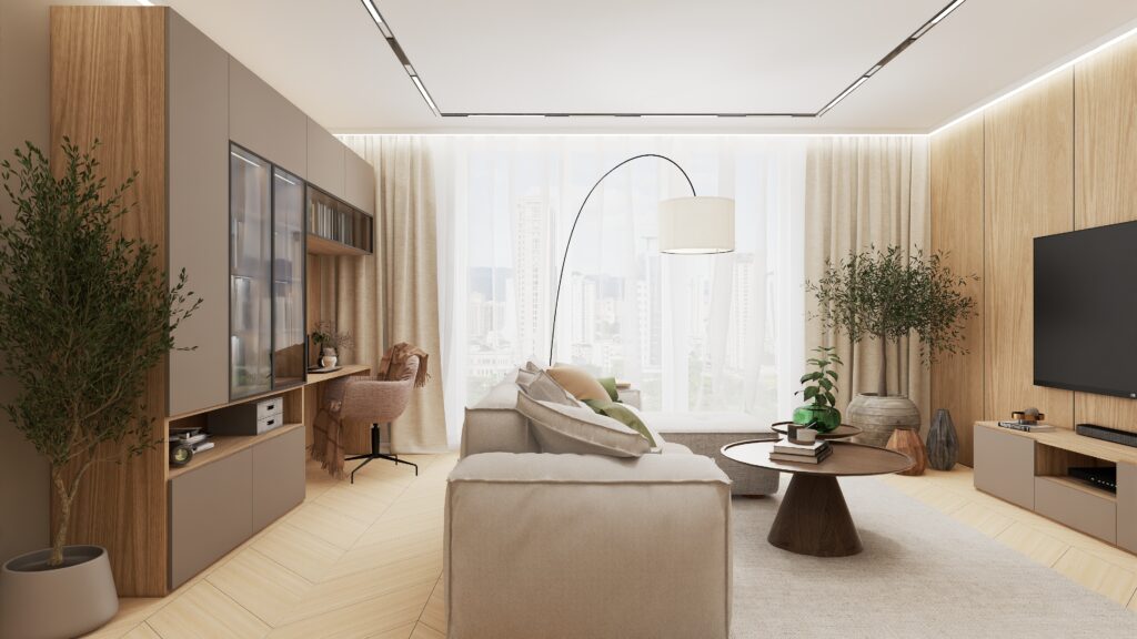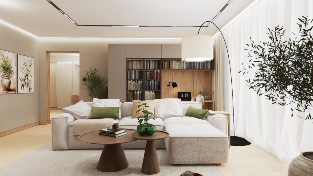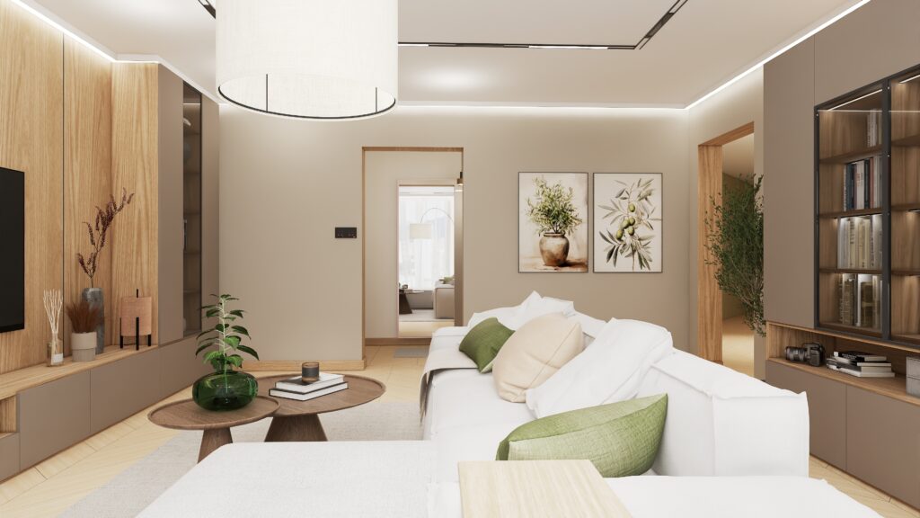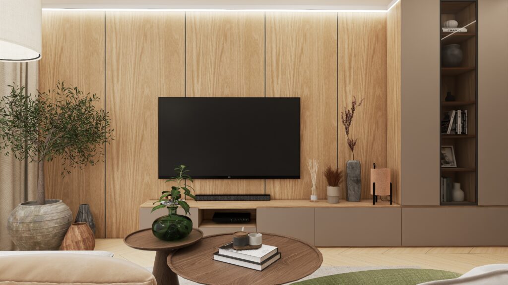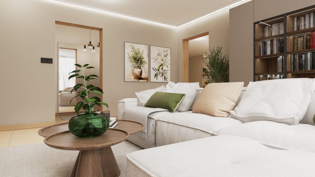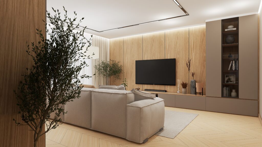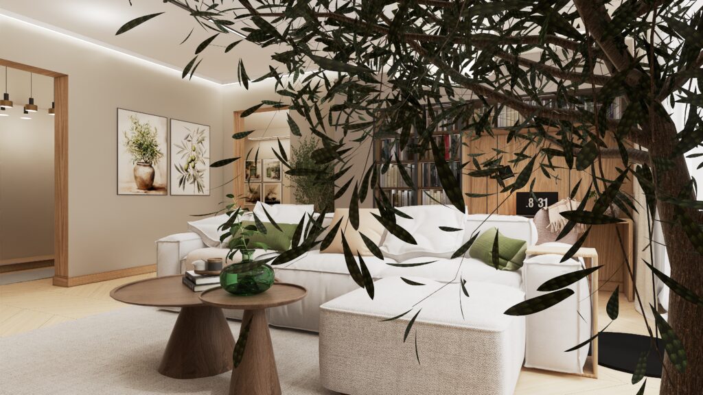 Przemyślano również każdy detal użytkowy – od sporej szafki RTV zapewniającej dużo miejsca do przechowywania, aż po odpowiednio wygospodarowaną przestrzeń na drzewka oliwkowe, które wprowadzają do wnętrza świeżość i naturalny urok. Designerski stolik kawowy podkreśla moc drewna i naturalnych materiałów, dopełniając całość eleganckim, a zarazem minimalistycznym akcentem.