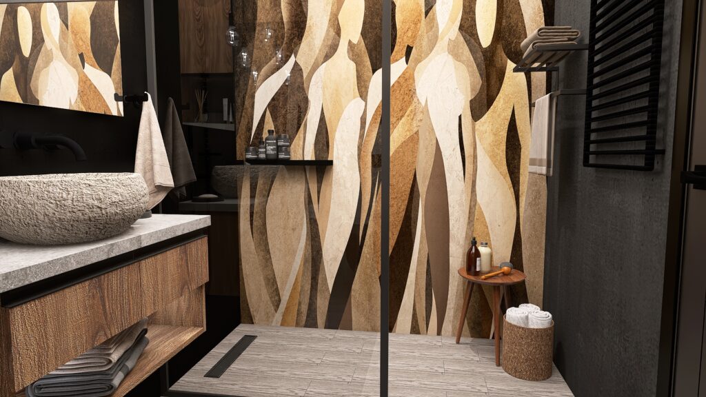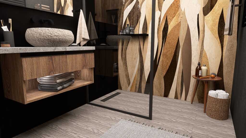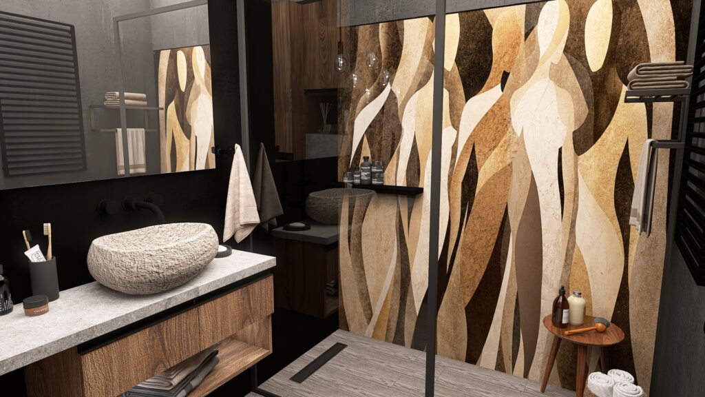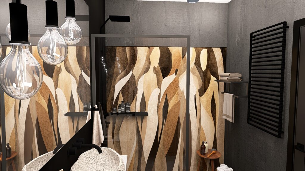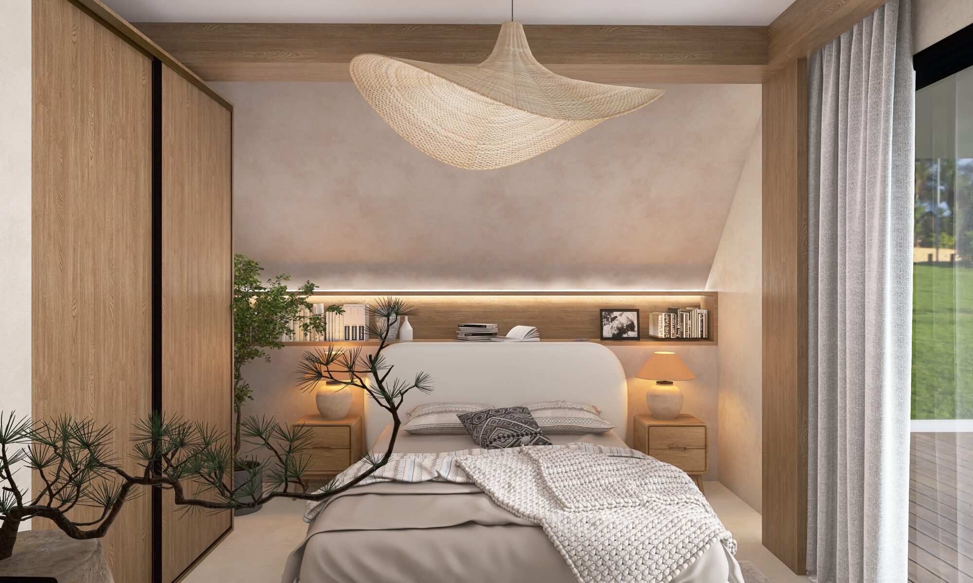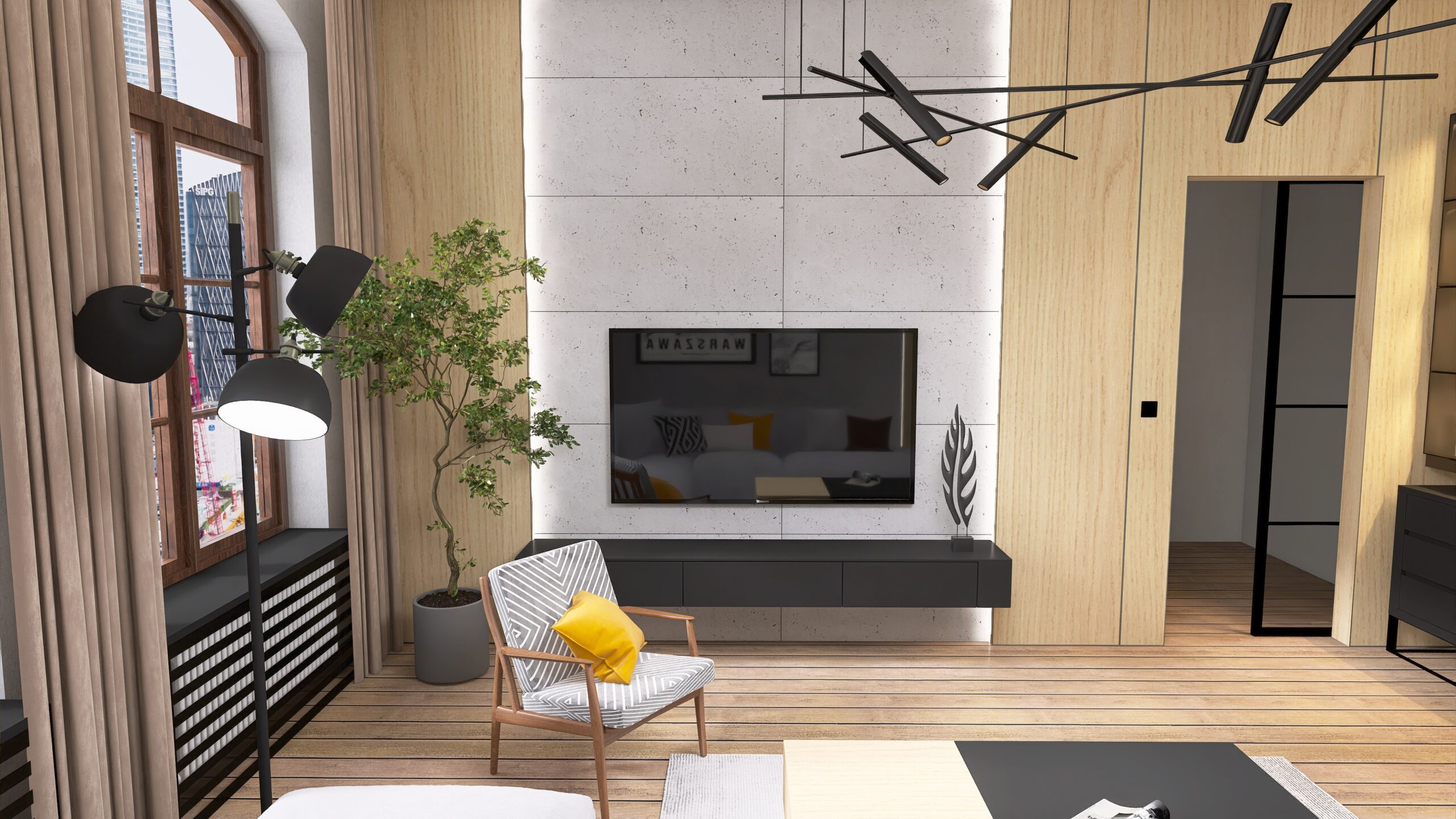 Przemyślano również każdy detal użytkowy – od sporej szafki RTV zapewniającej dużo miejsca do przechowywania, aż po odpowiednio wygospodarowaną przestrzeń na drzewka oliwkowe, które wprowadzają do wnętrza świeżość i naturalny urok. Designerski stolik kawowy podkreśla moc drewna i naturalnych materiałów, dopełniając całość eleganckim, a zarazem minimalistycznym akcentem.