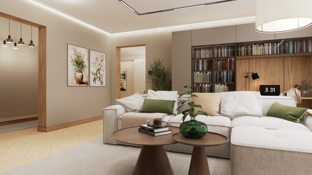 Serce domu stanowiące prawdziwą oazę spokoju – pokój dzienny zaprojektowany tak, by od pierwszego kroku, subtelnymi akcentami przenieść domowników w stan relaksu. Neutralna, delikatna kolorystyka ocieplona została naturalnym drewnem i oliwkową zielenią przewijającą się w dodatkach i roślinach. Dzięki temu wnętrze zyskuje lekkość, a jednocześnie niezwykłą harmonię i przyjemną atmosferę.
